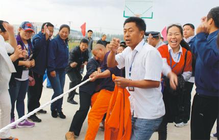 “一、二加油,一、二加油!哦…”拔河比賽啦啦隊(duì)正在喊號(hào)助威。