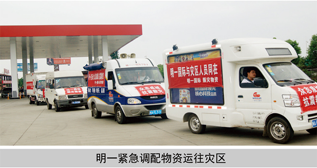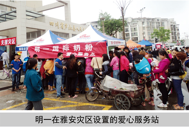 災難面前人人有愛, 4月20日,雅安地震發生后,遭受地震災情牽動著明一人的心,得知雅安災區急需奶粉消息后。明一國際啟動應急預案,緊急成立愛心小組,籌備物資,向災區捐贈愛心奶粉。