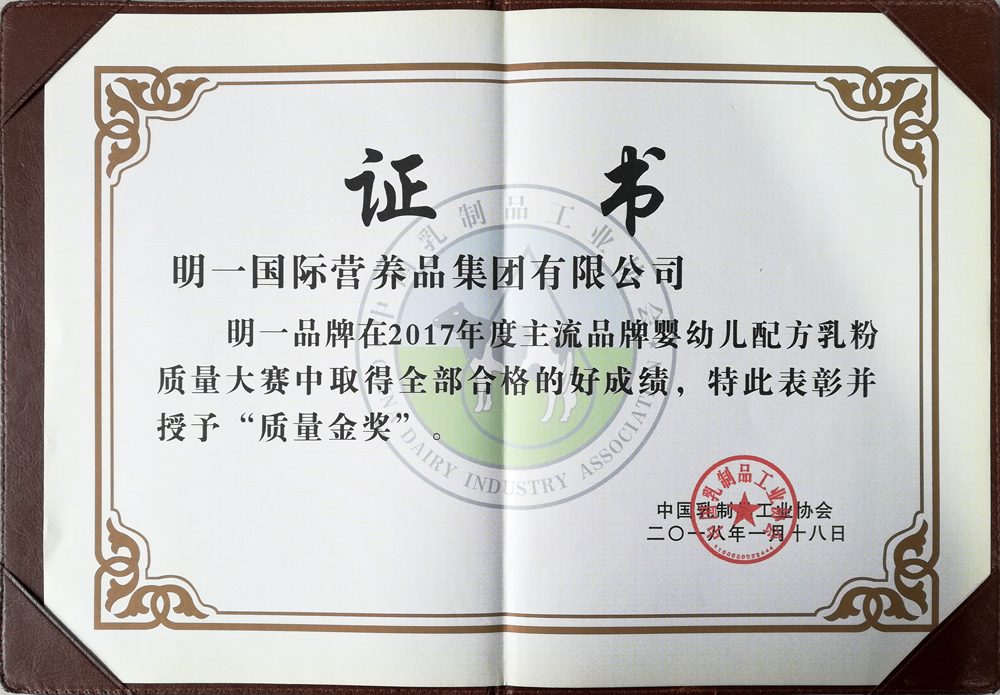 2018年1月18日,中國乳制品工業協會(以下簡稱中乳協)在京召開“首屆中國乳業質量年會及中乳協第六屆理事會二次會議”,對在2017年度嬰幼兒配方乳粉主流品牌質量大賽中,獲得優異成績的企業進行了表彰。明一國際再次榮獲“質量金獎”。