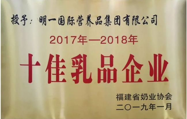 明一國際榮獲福建省奶業(yè)協(xié)會頒發(fā)的“2017-2018年十佳乳品企業(yè)”。