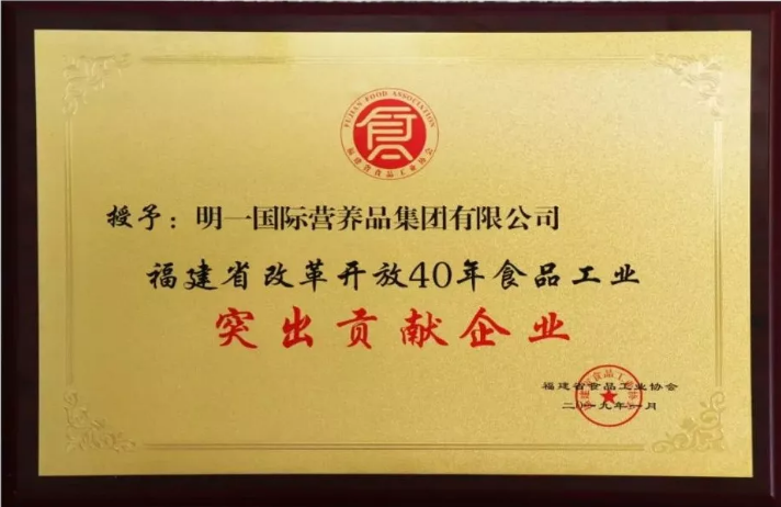 明一國際榮獲福建省食品工業(yè)協(xié)會頒發(fā)的“福建省改革開放40年食品工業(yè)突出貢獻企業(yè)”。