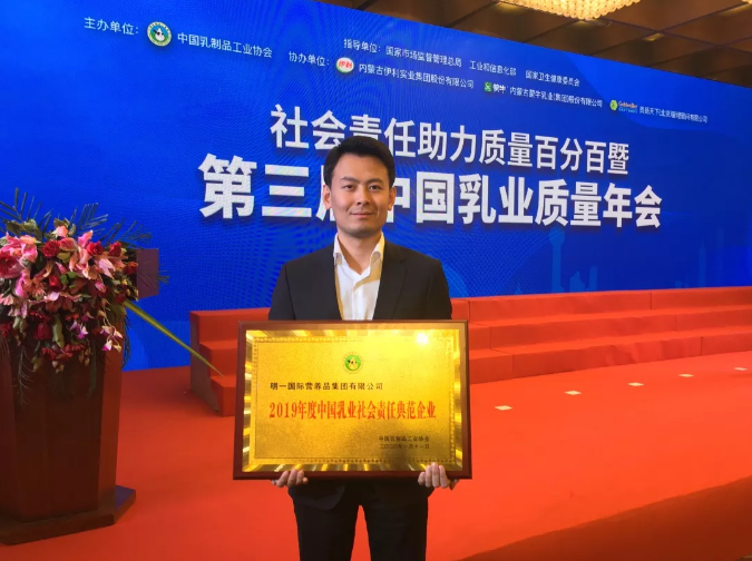會(huì)議對(duì)2019年度產(chǎn)品質(zhì)量和履行社會(huì)責(zé)任所取得優(yōu)異成績(jī)的企業(yè)進(jìn)行表彰,明一國(guó)際榮獲“質(zhì)量金獎(jiǎng)”、“2019年度中國(guó)乳業(yè)社會(huì)責(zé)任典范企業(yè)”殊榮。明一世代生態(tài)CEO陳宏鑫出席會(huì)議并領(lǐng)獎(jiǎng)。