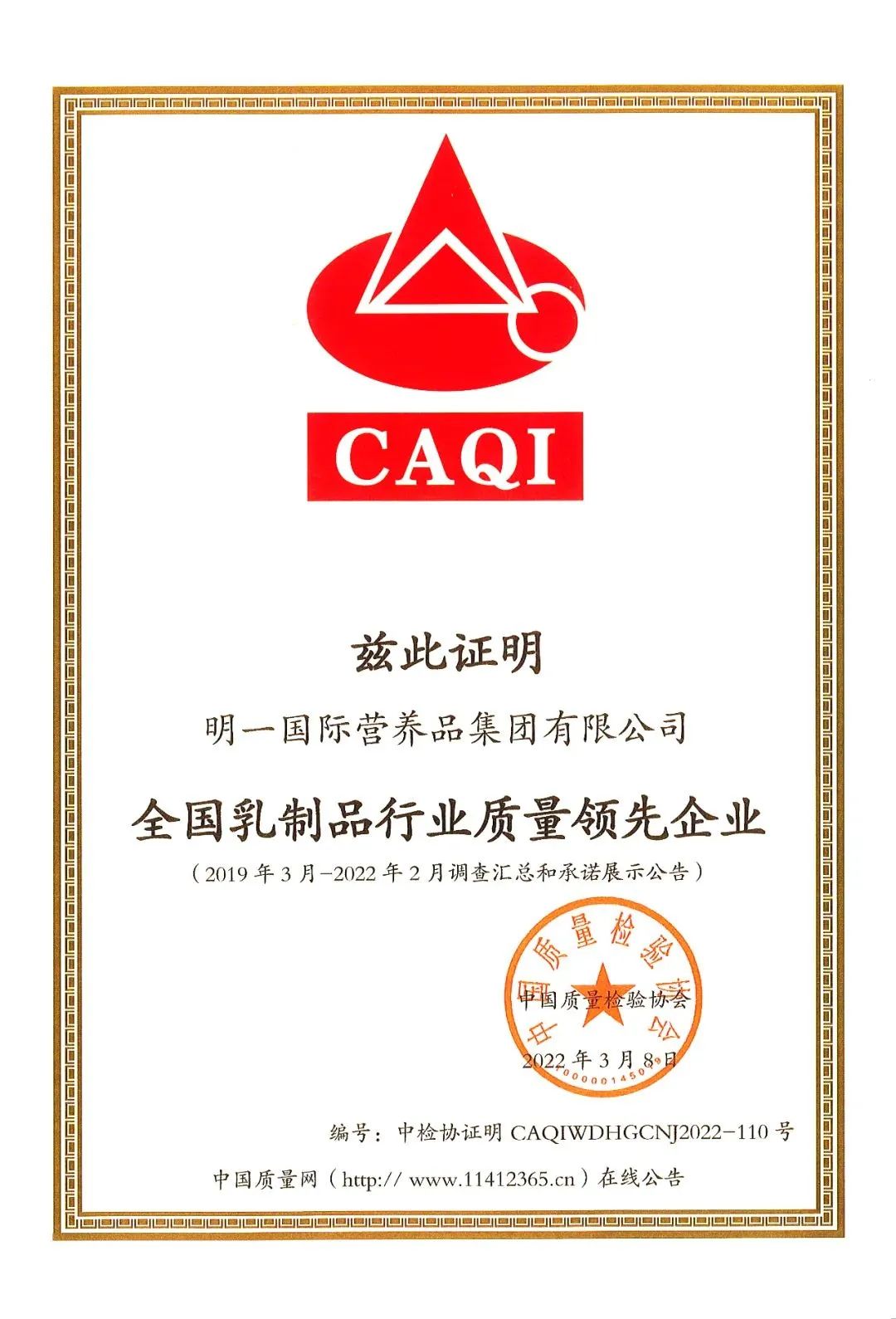 2022年315消費(fèi)者權(quán)益日,明一國(guó)際深入貫徹質(zhì)量安全理念,公開產(chǎn)品和服務(wù)質(zhì)量誠(chéng)信承諾,憑借過(guò)硬的質(zhì)量和良好的市場(chǎng)口碑,榮獲中國(guó)質(zhì)量檢驗(yàn)協(xié)會(huì)頒發(fā)的“全國(guó)產(chǎn)品和服務(wù)質(zhì)量誠(chéng)信示范企業(yè)”、“全國(guó)乳制品行業(yè)質(zhì)量領(lǐng)先企業(yè)”、“全國(guó)產(chǎn)品和服務(wù)質(zhì)量誠(chéng)信品牌”、“全國(guó)質(zhì)量檢驗(yàn)穩(wěn)定合格產(chǎn)品”四項(xiàng)殊榮。