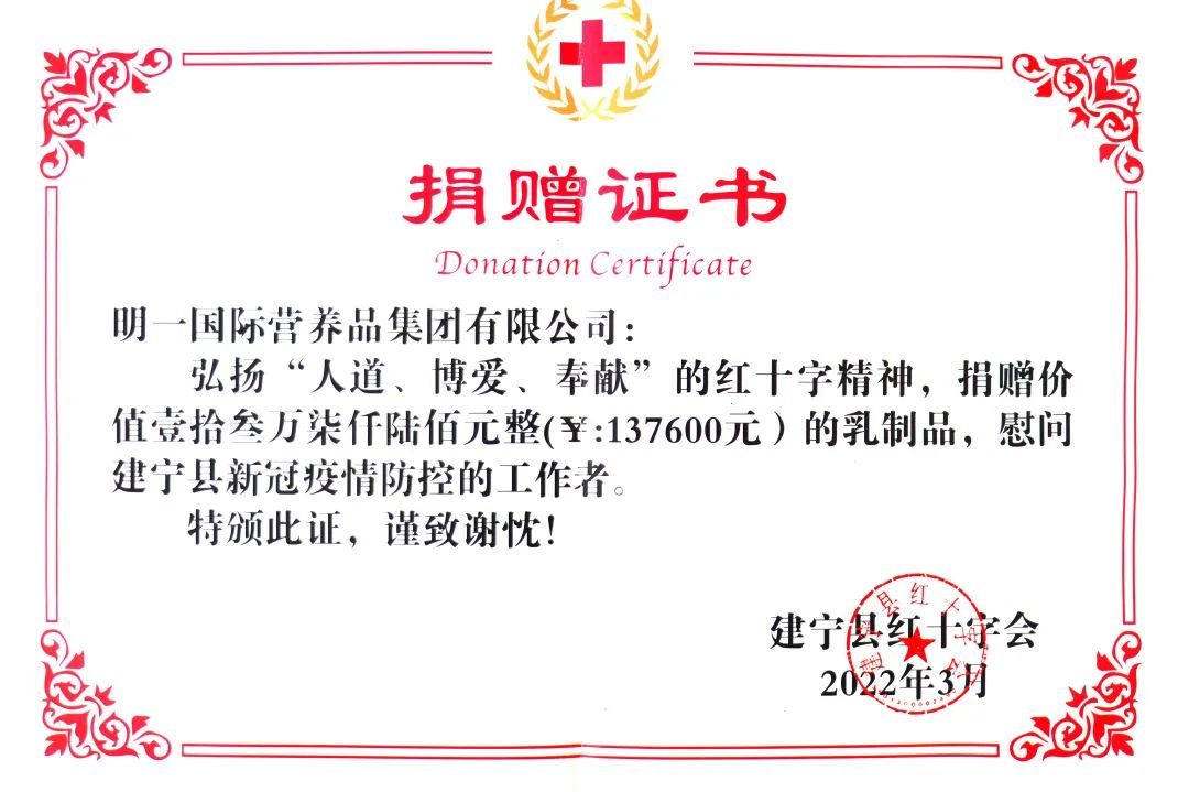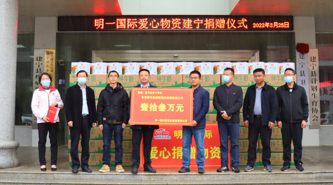 3月25日,明一國際再次向建寧縣紅十字會捐贈價值13.76萬元的物資,為堅守崗位的醫療部門、交通卡點、社區志愿者等一線抗疫人員提供營養支持。自2020年新冠疫情爆發以來,明一國際已累計捐贈700余萬元,彰顯企業社會擔當。
